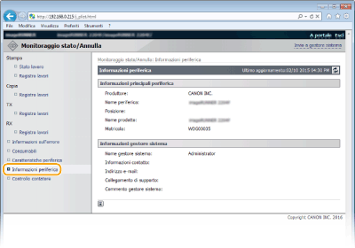 Vengono visualizzate le informazioni sulla macchina e su gestore sistema. Tali informazioni sono impostate in [Gestione sistema] nella pagina [Impostazioni/Registrazione].