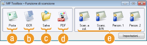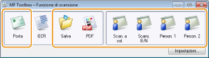 È possibile salvare i documenti acquisiti su computer, inoltrarli ad un'applicazione specifica per modificarli o allegarli ad un messaggio e-mail. MF Toolbox offre impostazioni predefinite per ciascuno scopo, inclusa la conversione in PDF e la scansione a colori. È possibile eseguire la scansione in modo semplice selezionando un'impostazione predefinita.