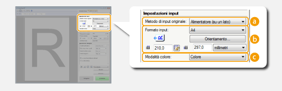 Specificare il metodo input del documento (vetro di lettura o alimentatore), dimensione del documento, modalità colore e altre impostazioni.