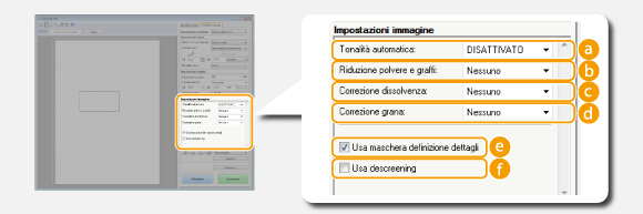 Quando si esegue la scansione di un documento utilizzando un software OCR o un'altra applicazione, la schermata di ScanGear MF potrebbe non essere visualizzata. In questo caso, il documento viene acquisito con le impostazioni dell'applicazione utilizzata. Tuttavia, se l'applicazione non dispone delle impostazioni seguenti, abilitarle qui in modo che vengano applicate durante la scansione.