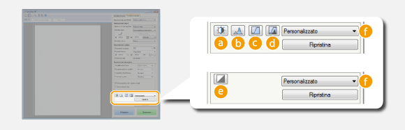 Se si fa clic sulla scheda [Modalità avanzata] nella schermata ScanGear MF, sarà possibile effettuare regolazioni più avanzate per la qualità dell'immagine, rispetto a quelle effettuabili in Modalità semplice. È anche possibile registrare le impostazioni modificate come Impostazioni preferite. Per informazioni più dettagliate, fare clic sull'icona