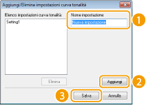 Viene visualizzata la schermata [Aggiungi/Elimina impostazioni curva tonalità] o [Aggiungi/Elimina Impostazioni soglia].