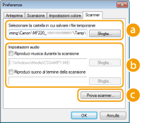 È possibile specificare la melodia o i toni riprodotti quando la macchina esegue la scansione o al termine della scansione. Fare clic su [Sfoglia] per specificare un file da riprodurre. Sono supportati i seguenti formati (estensioni) di file: