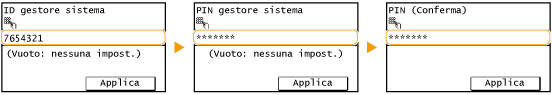 Registrare l'ID gestore sistema, un ID inteso esclusivamente per gli amministratori. È inoltre possibile impostare un PIN per l'ID gestore sistema. Se l'ID è abilitato è possibile accedere a <Impostazioni rete> e <Impostazioni gestione sistema> solo dopo che l'ID gestore sistema e il PIN sono stati immessi correttamente. Per impostazione predefinita, ID e PIN sono entrambi impostati su "7654321". Modificare tale impostazione per motivi di sicurezza. Le informazioni sull'ID gestore sistema sono fondamentali per la protezione della macchina, pertanto assicurarsi che l'ID gestore sistema e il PIN siano noti solo agli amministratori.