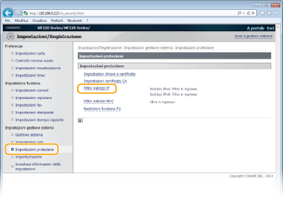 Se gli indirizzi IP sono immessi in modo non corretto, potrebbe non essere possibile accedere alla macchina dalla IU remota, in questo caso è necessario impostare <Filtro indirizzi IPv4> o <Filtro indirizzi IPv6> a <Off>. Filtro indirizzi IPv4 Filtro indirizzi IPv6