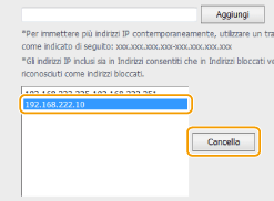 Eliminazione di un indirizzo IP dalle eccezioni Selezionare un indirizzo IP e fare clic su [Cancella].