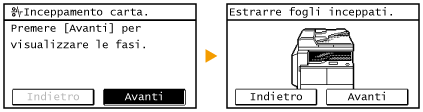 Se si verifica un inceppamento di carta, sullo schermo viene visualizzato <Inceppamento carta.>. Premere <Avanti> per visualizzare una soluzione. Se le procedure visualizzate sullo schermo sono di difficile comprensione, vedere le sezioni seguenti per liberare la carta inceppata.