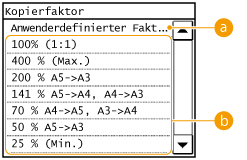 Sie können zum Vergrößern oder Verkleinern von Kopien einen voreingestellten Kopierfaktor wie <A5> → <A4> auswählen oder in Schritten von 1 % einen anwenderdefinierten Kopierfaktor einstellen.