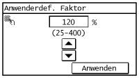 oder den Zahlentasten den Kopierfaktor ein, und drücken Sie <Anwenden>. Sie können in Schritten von 1 % einen Kopierfaktor zwischen 25 % und 400 % einstellen.