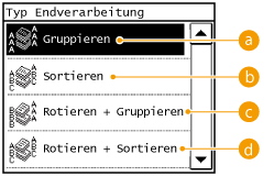 Wählen Sie <Gruppe>, <Sortieren>, <Rotieren + Gruppieren> oder <Rotieren + Sortieren> für die Reihenfolge kopierter Dokumente aus. Diese Funktion ist nützlich, wenn Sie Handzettel für Besprechungen oder Präsentationen vorbereiten.