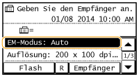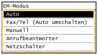 Sie können das Gerät so einstellen, dass es Faxe automatisch empfängt, nachdem das Telefon bei einem eingehenden Anruf eine bestimmte Zeit lang geklingelt hat. Umschalten zu Auto EM