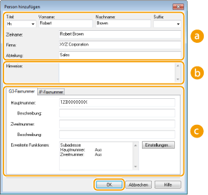 Geben Sie eine Faxnummer oder mehrere Faxnummern ein. Falls erforderlich, können Sie zwischen die Ziffern Bindestriche einfügen. Wenn Sie Erläuterungen wie "Privat" oder "Geschäftlich" zu den Faxnummern hinzufügen möchten, geben Sie diese Angaben in [Beschreibung] ein.