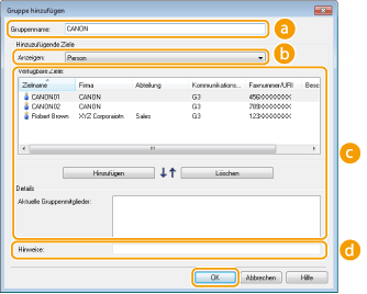 Wählen Sie die Empfänger aus, die für die Gruppenwahl gespeichert werden sollen, und klicken Sie auf [Hinzufügen]. Die ausgewählten Empfänger werden in [Aktuelle Gruppenmitglieder] angezeigt.
