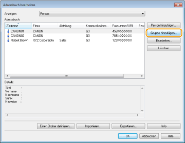 In diesem Abschnitt wird beschrieben, wie Sie Empfänger im Adressbuch für PC-Faxe speichern. Sie können einzelne Empfänger aus den im Adressbuch gespeicherten Empfängern auswählen und zu einer Empfängergruppe zusammenfassen (Gruppenwahl) und dann ganz komfortabel Faxe an mehrere Empfänger auf einmal senden.