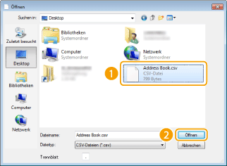 Sie können mit Anwendungen wie Microsoft Excel erstellte Adressbuchdaten im CSV-Format in das Gerät importieren oder die Adressbuchdaten in eine Datei exportieren und dann für ein anderes Faxgerät oder in anderen Anwendungen verwenden.