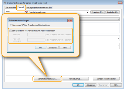 Wenn Sie in dem Dialogfeld, das angezeigt wird, wenn Sie auf der Registerkarte [Spezial] auf [Sicherheitseinstellungen] klicken, die Option [Beim Exportieren von Adressliste durch Passwort schützen] gewählt haben, wird ein Dialogfeld für die Eingabe eines Passworts angezeigt, sobald Sie auf [Exportieren] klicken. Wenn Sie weitere Informationen benötigen, klicken Sie auf dem Faxtreiberbildschirm auf [Hilfe].