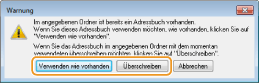 Wenn in dem in Schritt 4 ausgewählten Ordner bereits ein Adressbuch vorhanden ist, wird die folgende Meldung angezeigt. Klicken Sie auf [Verwenden wie vorhanden], wenn Sie das vorhandene Adressbuch verwenden möchten, oder auf [Überschreiben], um das Adressbuch des Faxtreibers zu verwenden.