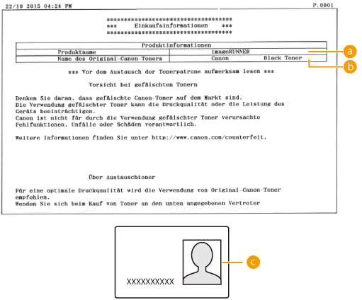 Sie können die Dokumentation Ihres autorisierten Canon Händlers vor Ort (Visitenkarte, Informationen usw.) scannen und registrieren. So können Sie dessen Kontaktdaten drucken, wenn das Verbrauchsmaterial zur Neige geht.