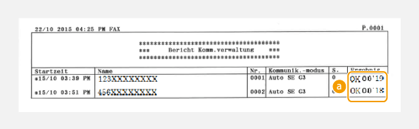 Sie können die Faxlogs für gesendete und empfangene Dokumente in einem Kommunikationsverwaltungsbericht drucken. Sie können den Bericht nach jeweils 40 Übertragungen oder manuell drucken.