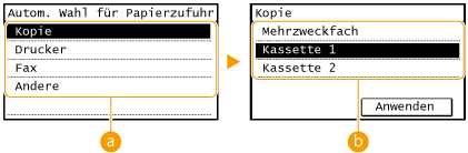 ). Für das Drucken auf Papier aus dem Mehrzweckfach ist die automatische Kassettenauswahl immer aktiviert.