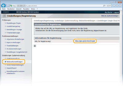 Klicken Sie auf den Link für die URL, die für [URL für Registrierung] angezeigt wird.