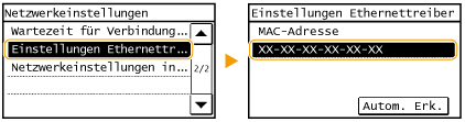 Wenn Sie das Gerät an einen Switching-Hub oder eine Bridge anschließen, kann es auch bei einer korrekt konfigurierten IP-Adresse zu einem Kommunikationsfehler kommen. Dieses Problem können Sie lösen, indem Sie ein Intervall einstellen und so den Start der Kommunikation verzögern. Einstellen einer Wartezeit für die Netzwerkverbindung