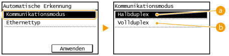 tippen Sie auf <Halbduplex> oder <Vollduplex>.![]() <Halbduplex>Daten können nur abwechselnd gesendet und empfangen werden. Wählen Sie diese Einstellung, wenn das Gerät mit einem Netzwerkgerät verbunden ist, das im Halbduplexmodus arbeitet.