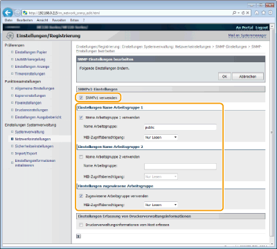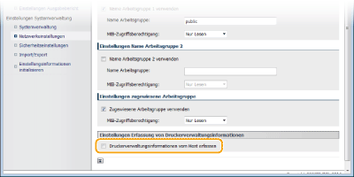 Aktivieren Sie das Kontrollkästchen [Zugewiesene Arbeitsgruppe verwenden], und legen Sie die Einstellung [MIB-Zugriffsberechtigung] fest.