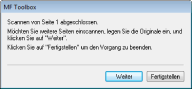 Wenn der unten dargestellte Bildschirm angezeigt wird, können Sie mit dem Scannen der Dokumente fortfahren. (Wenn Sie immer nur eine Seite scannen können, weil zum Beispiel das JPEG-Format angegeben ist, wird dieser Bildschirm nicht angezeigt.)