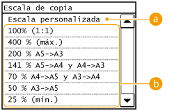 Puede ampliar o reducir las copias utilizando una escala de copia preestablecida, como por ejemplo <A5> → <A4>, o estableciendo una escala de copia personalizada en incrementos del 1%.
