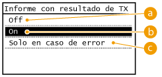 Si selecciona <On> o <Solo en caso de error>, una parte de un documento de fax podrá incluirse en el informe. Establezca <Incluir imagen TX> en <On>.