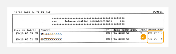 Podrá consultar los registros de fax de los documentos enviados y recibidos imprimiendo un Informe de gestión de comunicaciones. El informe puede imprimirse automáticamente cada 40 transmisiones, o lo podrá imprimir manualmente.