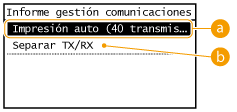 No puede seleccionar <Informe de gestión de comunicaciones> si <Off> está establecido para <Mostrar registro de trabajos> en <Opciones de gestión del sistema>.