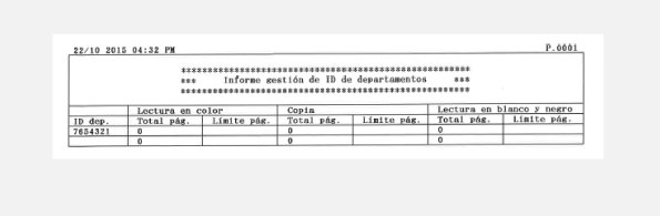 Cuando la Gestión ID de departamentos esté habilitada, podrá imprimir un informe para comprobar el número de páginas total copiadas, impresas y escaneadas para cada ID de departamento. El informe le permite controlar el uso y mejorar la gestión.