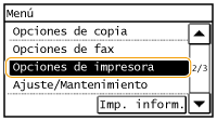Todas las opciones sobre la impresora se muestran con descripciones breves. Las opciones predeterminadas aparecen marcadas con una cruz (