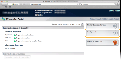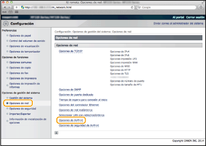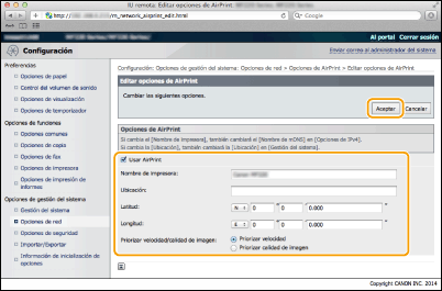 Puede registrar la información, incluido el nombre del equipo y la ubicación de instalación, que se utilice para identificar el equipo. Asimismo, puede deshabilitar la función AirPrint del equipo. Utilice la IU remota para cambiar estas opciones.