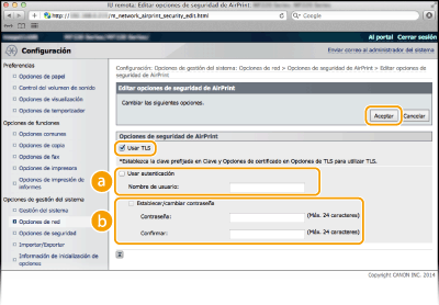 Seleccione la casilla de verificación [Usar TLS], especifique los elementos necesarios y haga clic en [Aceptar].