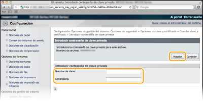 Introduzca el nombre del par de claves y la contraseña y, a continuación, haga clic en [Aceptar].