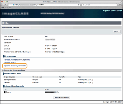 Si no aparece la pantalla para AirPrint o si desea especificar las opciones del certificado CA
