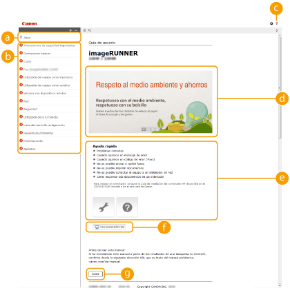 Haga clic para mostrar información sobre cómo ver el e-Manual, cómo realizar una búsqueda y otra información.