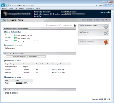 Para utilizar el equipo de forma remota, debe introducir la dirección IP del equipo en un navegador web e iniciar la IU remota. Compruebe la dirección IP establecida en el equipo previamente (