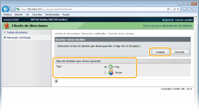 Seleccione [Tipo de destino que desea guardar] y haga clic en [Aceptar].