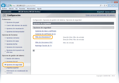 Si las direcciones IP se introducen de forma incorrecta, es posible que no pueda acceder al equipo desde la IU remota, en cuyo caso deberá establecer <Filtro de direcciones IPv4> o <Filtro de direcciones IPv6> en <Off>. Filtro de direcciones IPv4 Filtro de direcciones IPv6