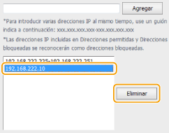 Eliminación de una dirección IP de las direcciones excluidas Seleccione una dirección IP y haga clic en [Eliminar].