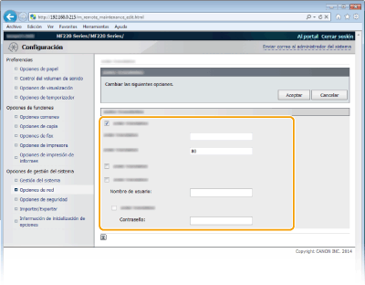 Para habilitar la autenticación a través del servidor proxy, seleccione la casilla de verificación e introduzca hasta 24 caracteres alfanuméricos en el nombre de usuario en el cuadro de texto [Nombre de usuario].