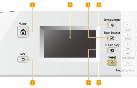 Púlsela para consultar el estado de impresión, para ver el historial de uso o para ver las opciones de configuración de red, como la dirección IP del equipo. Asimismo, puede consultar el estado del equipo, como por ejemplo, la cantidad restante de papel y tóner, o si se han producido errores.