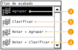 A la hora de preparar varias copias de documentos de varias páginas, puede seleccionar <Grupo>, <Clasificar>, <Rotar + Agrupar> o <Rotar + Clasificar> para ordenar los papeles de copia. Esta función resulta útil cuando se preparan folletos para reuniones o presentaciones.
