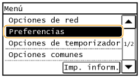 Todas las opciones sobre el volumen del sonido y la pantalla se muestran con descripciones breves. Las opciones predeterminadas aparecen marcadas con una cruz (