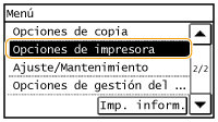 Todas las opciones sobre la impresora se muestran con descripciones breves. Las opciones predeterminadas aparecen marcadas con una cruz (