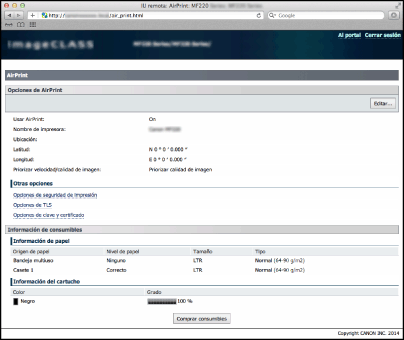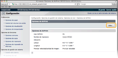Puede registrar la información, incluido el nombre del equipo y la ubicación de instalación, que se utilice para identificar el equipo. Asimismo, puede deshabilitar la función AirPrint del equipo. Utilice la IU remota para cambiar estas opciones.